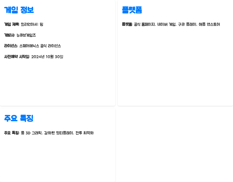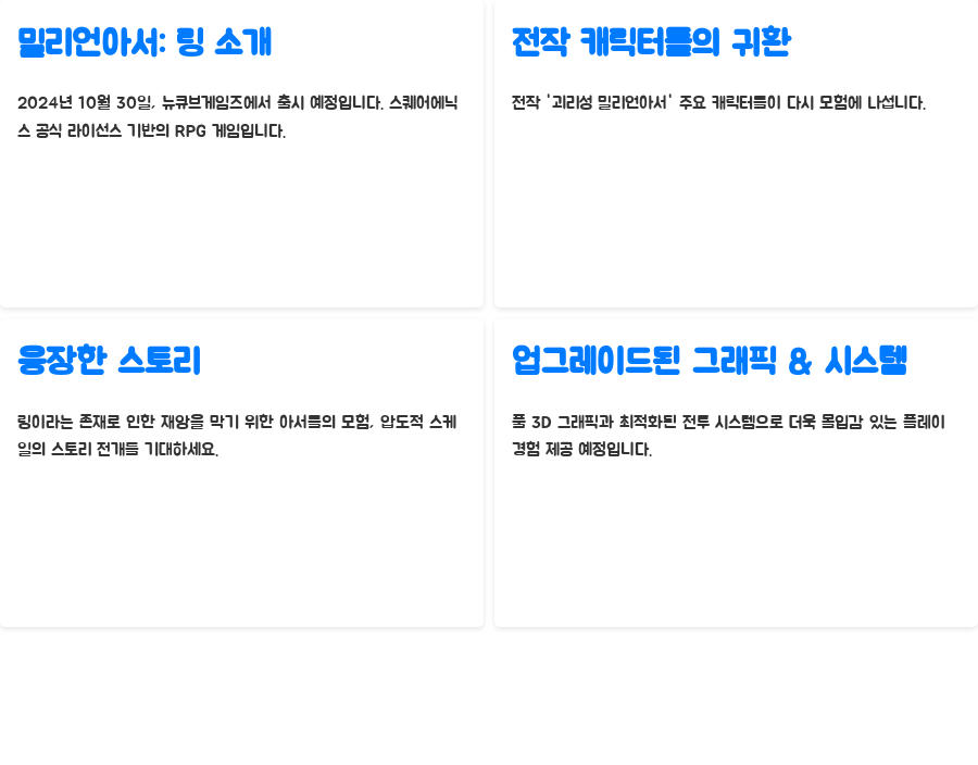 2024년 10월 30일, 뉴큐브게임즈에서 야심 차게 선보이는 RPG, 밀리언아서: 링! 스퀘어에닉스의 공식 라이선스를 기반으로 제작되어 원작 팬들에게는 더욱 큰 기대감을 안겨주는 작품입니다.