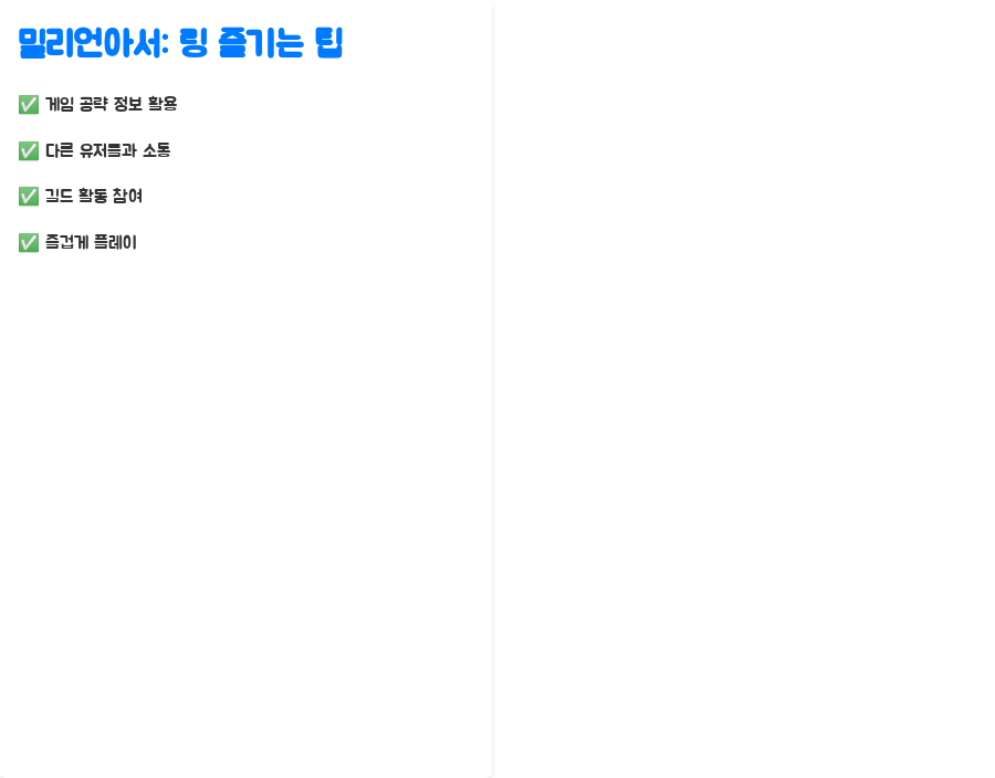 밀리언아서: 링을 더욱 즐겁게 플레이하기 위한 몇 가지 추천 사항을 알려드립니다. 게임 내 공략 정보를 적극적으로 활용하여 효율적인 플레이를 하세요.