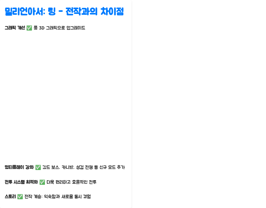 전작 '괴리성 밀리언아서'와 비교했을 때, 밀리언아서: 링은 풀 3D 그래픽으로 업그레이드되어 한층 더 화려하고 몰입도 높은 게임 경험을 제공합니다.