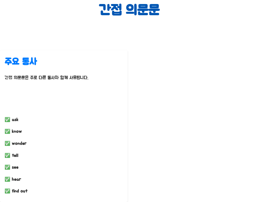 간접 의문문은 혼자 쓰이기보다는, 다른 동사와 함께 사용되는 경우가 많아요. 특히, 'ask, know, wonder, tell, see, hear, find out' 등의 동사와 자주 함께 쓰입니다.