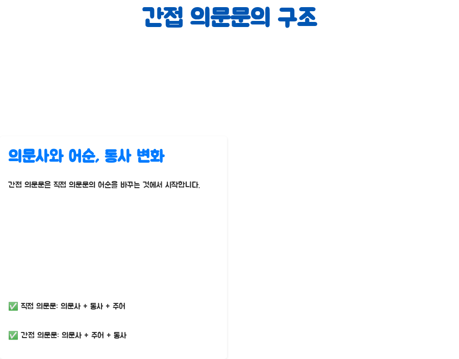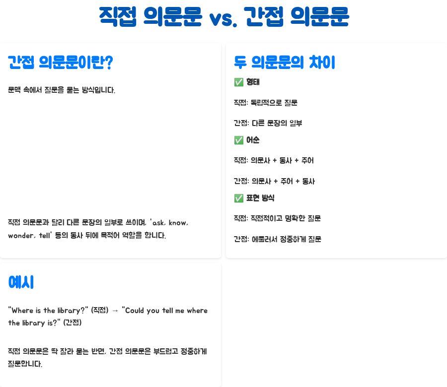 간접 의문문은 영어 문장에서 꽤 까다롭게 느껴지는 부분 중 하나죠. 직접적인 질문 대신, 다른 문장 안에 묻어서 질문하는 형태라 처음엔 좀 낯설게 느껴질 수 있어요. 하지만, 걱정 마세요! 오늘 제가 간접 의문문의 구조와 사용법을 쉽고 친절하게 풀어서 알려드릴 테니까요. 이 글을 다 읽고 나면, 간접 의문문이 더 이상 어렵게 느껴지지 않을 거예요!