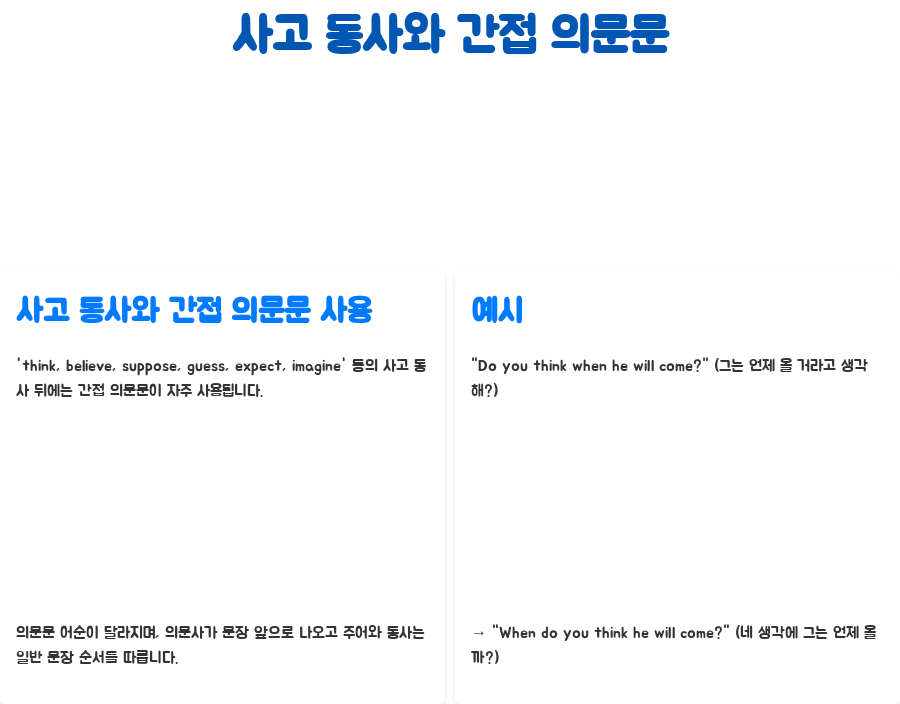 'think, believe, suppose, guess, expect, imagine' 등의 사고 동사 뒤에는 간접 의문문이 자주 사용됩니다. 이때, 의문문의 어순이 조금 달라져요. 의문사가 문장 앞으로 나오고, 주어와 동사는 일반적인 문장 순서를 따릅니다.