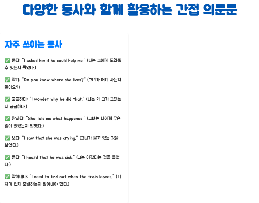 다음은 간접 의문문과 함께 자주 쓰이는 동사들의 예시입니다.