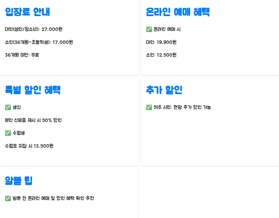 하지만 조금만 더 현명하게 계획한다면, 훨씬 저렴하게 즐길 수 있다는 사실! 온라인 예매를 통해 대인은 19,900원, 소인은 12,500원에 입장할 수 있습니다.