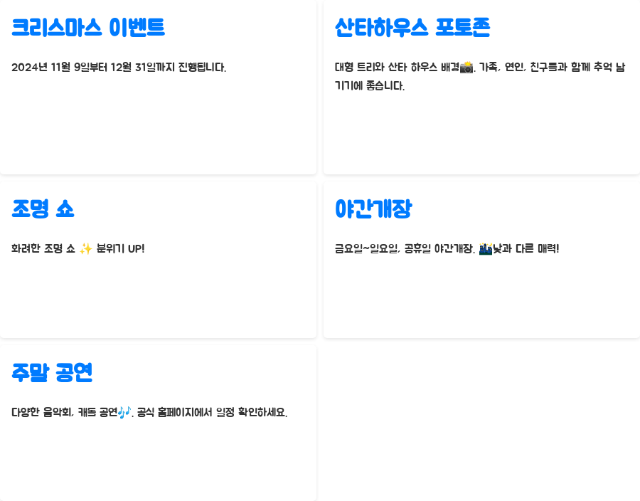| 주요 이벤트 | 산타하우스 포토존, 조명 쇼, 주말 공연 |