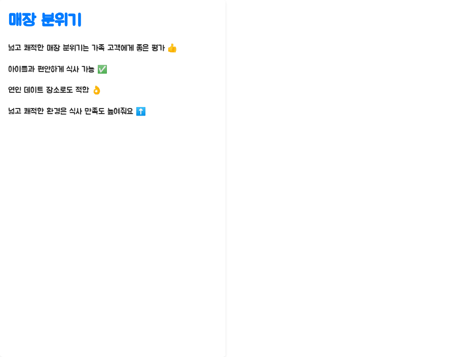맛있는 음식과 쾌적한 분위기, 그리고 편리함까지 더해진 이곳에서 즐거운 시간을 보내시길 바랍니다!