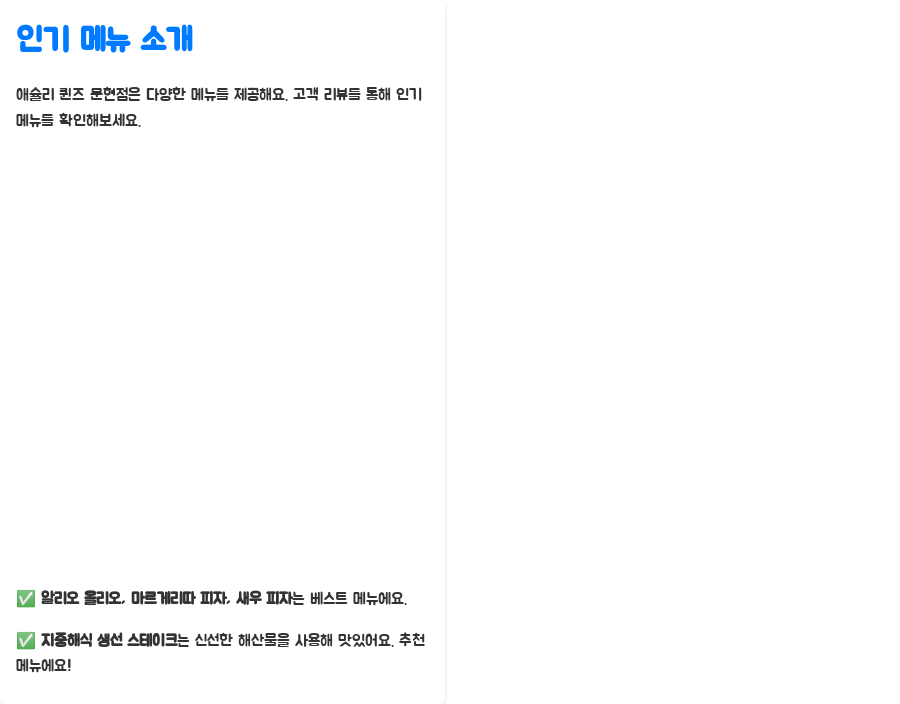 | 인기 메뉴 | 알리오 올리오, 마르게리따 피자, 새우 피자, 지중해식 생선 스테이크 |