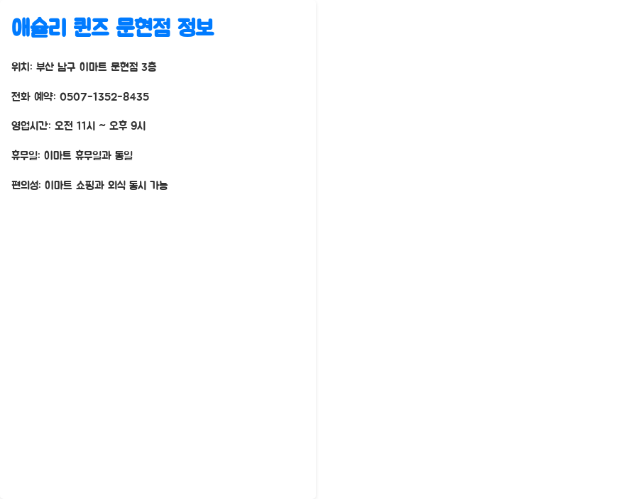 먼저 애슐리 퀸즈 문현점의 기본적인 정보부터 살펴볼까요? 부산 남구 이마트 문현점 3층에 위치한 이곳은 0507-1352-8435로 전화 예약도 가능해요.