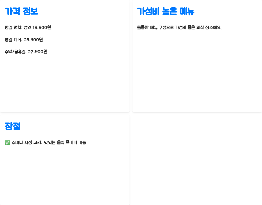가격 대비 훌륭한 메뉴 구성으로 가성비 좋은 외식 장소로 손꼽히는 이유를 알 수 있죠.