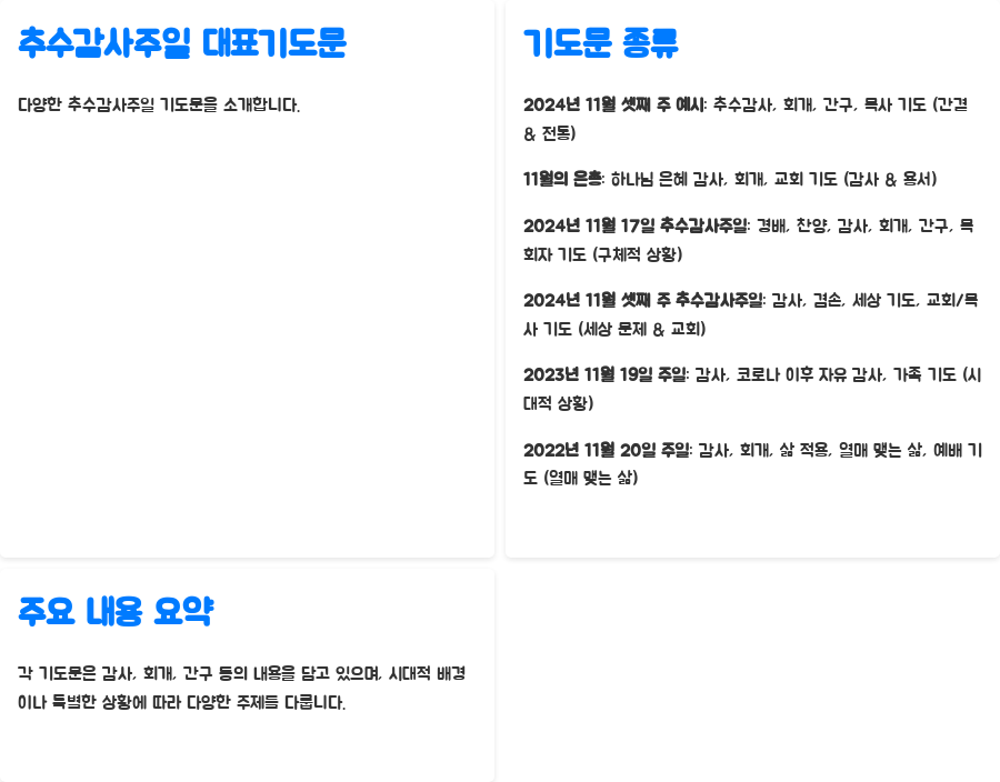 | 2024년 11월 셋째 주 추수감사주일 | 감사, 겸손, 세상의 어려움에 대한 기도, 교회와 목사를 위한 기도 | 세상 문제에 대한 관심과 교회 사역에 대한 기도 포함 |