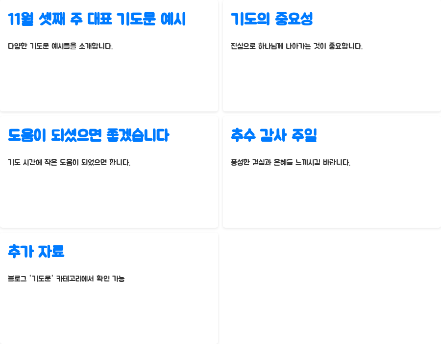 오늘 다양한 11월 셋째 주 대표 기도문 예시들을 살펴보았습니다.