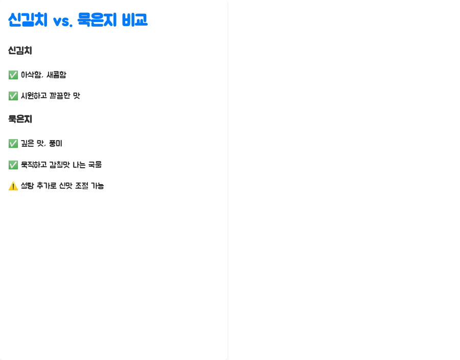묵은지는 깊은 맛과 진한 풍미가 특징이며, 찌개를 끓였을 때 더욱 묵직하고 감칠맛 나는 국물을 만들어냅니다. 취향에 따라 신김치 또는 묵은지를 선택하여 사용하면 됩니다. 묵은지를 사용할 경우, 설탕을 약간 넣어 신맛을 조절하는 것이 좋습니다.