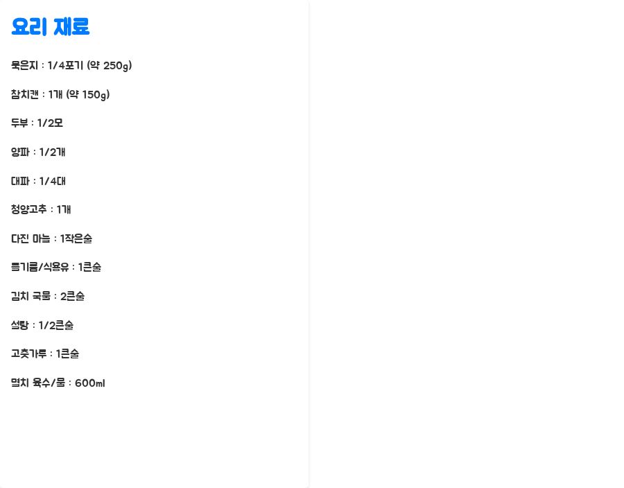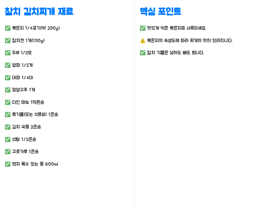 묵은지 1/4포기(약 250g), 참치캔 1개(150g), 두부 1/2모, 양파 1/2개, 대파 1/4대, 청양고추 1개, 다진 마늘 1작은술, 들기름(또는 식용유) 1큰술, 김치 국물 2큰술, 설탕 1/2큰술, 고춧가루 1큰술, 멸치 육수 또는 물 600ml면 충분합니다. 여기서 핵심은 잘 익은 묵은지입니다.