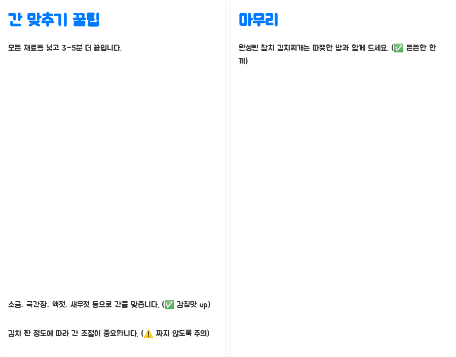 너무 짜지 않도록 주의하며 간을 맞추는 것이 중요합니다. 김치의 짠 정도에 따라 간을 조절해 주세요. 완성된 참치 김치찌개는 따뜻한 밥과 함께 즐기면 최고입니다!