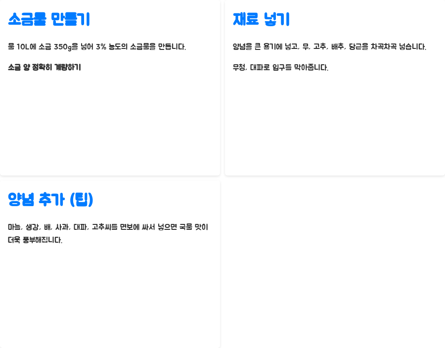 배추는 소금에 절여 물기를 빼주는 것이 중요합니다. 옥이님처럼 굵은 소금을 사용해서 5시간 정도 절여주면 무에서 시원한 맛이 더 잘 우러나옵니다. 노란장미님처럼 천일염을 사용하여 절이는 것도 좋습니다.