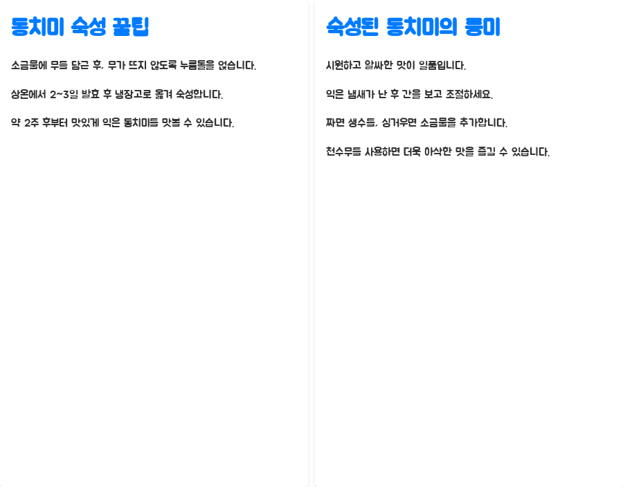 Q3. 동치미 국물에 단맛을 더하고 싶으면 어떻게 해야 하나요? A. 옛날 동치미는 단맛을 첨가하지 않지만, 단맛을 원한다면 사과나 배를 추가하거나, 숙성 후 매실청을 넣어 먹으면 됩니다.