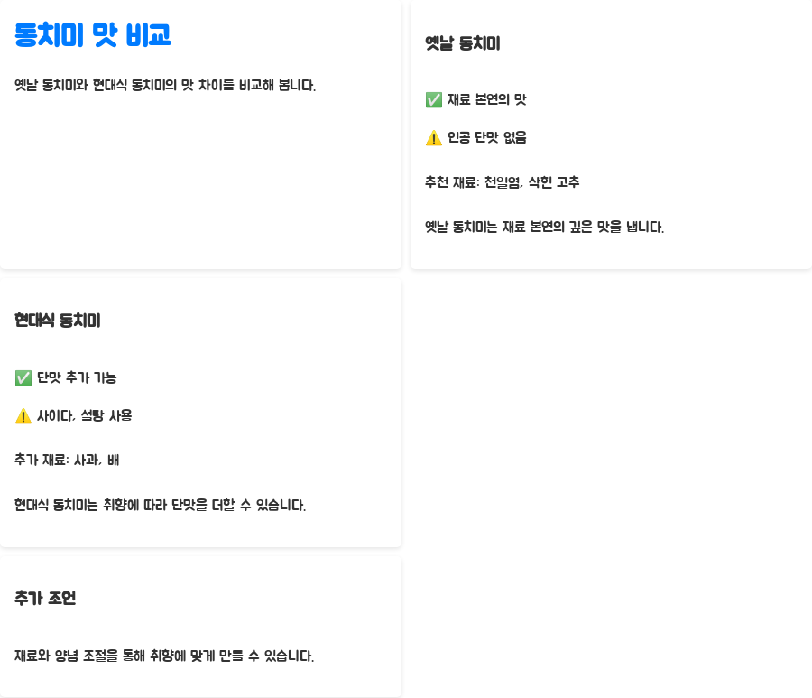 옛날 동치미는 인공적인 단맛을 첨가하지 않고 재료 본연의 맛을 살리는 것이 특징입니다. 반면 현대식 동치미는 사이다나 설탕을 넣어 단맛을 더하는 경우가 많습니다. 어떤 방식을 선택하든 취향에 따라 재료와 양념을 조절하면 됩니다.