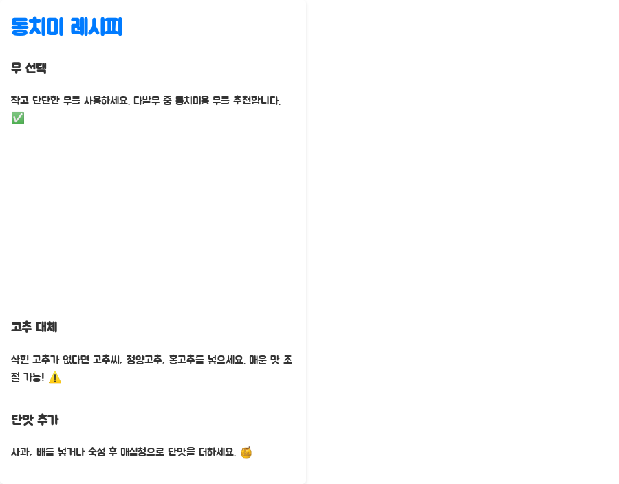 Q1. 동치미 무는 어떤 종류를 사용해야 하나요? A. 동치미용 무는 일반 무보다 크기가 작고 단단한 것이 좋습니다. 다발무 중에서 동치미용으로 나온 작은 무를 사용하면 아삭한 식감을 살릴 수 있습니다.