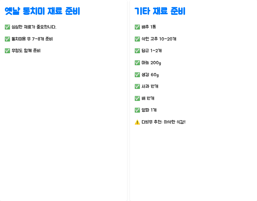 옛날 동치미의 깊은 맛을 원한다면 천일염과 삭힌 고추를 사용하고, 단맛을 더하고 싶다면 사과나 배를 추가하는 것도 좋습니다.