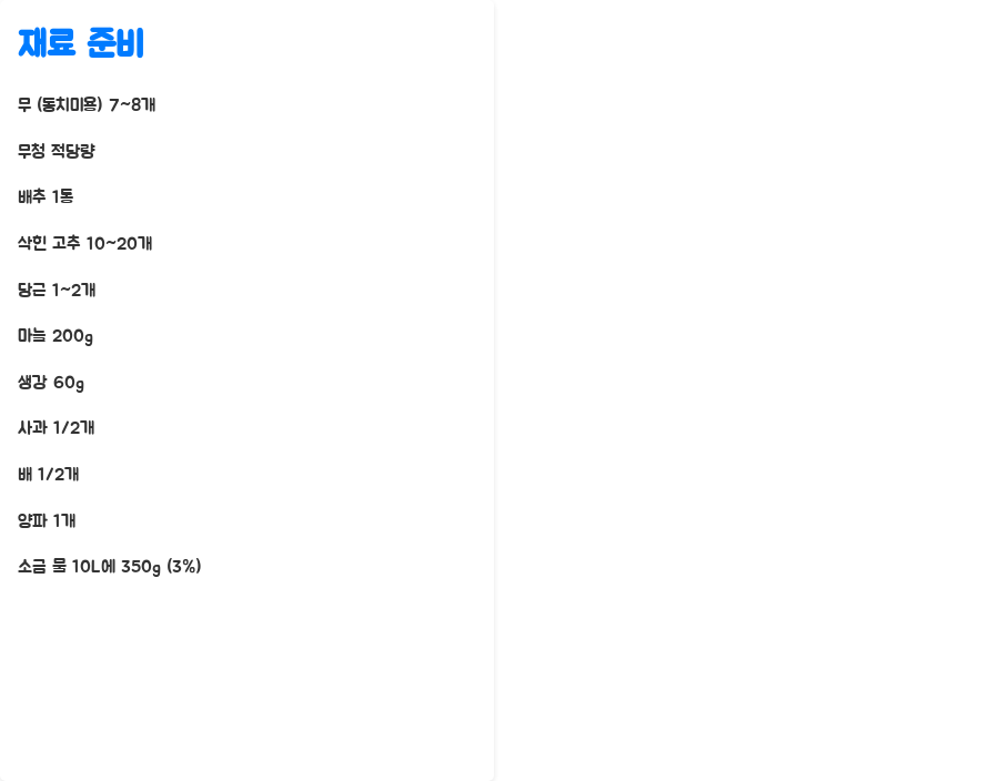 배추는 1통, 삭힌 고추는 102개 정도면 충분합니다. 양념으로는 마늘 200g, 생강 60g을 준비하고, 부재료로 사과 반 개, 배 반 개, 양파 1개를 준비합니다. 옥이님의 레시피처럼 동치미용 다발무를 사용하는 것도 좋은 방법입니다. 동치미용 무는 일반 무보다 크기가 작고 단단해서 아삭한 식감을 더욱 살려줍니다.