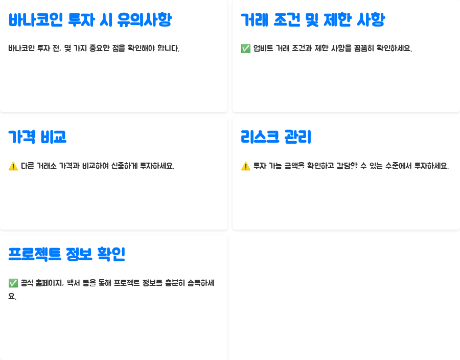 바나코인에 투자하기 전, 몇 가지 유의사항을 꼭 확인해야 합니다. 첫째, **업비트에서 안내하는 거래 조건과 제한 사항을 숙지**해야 합니다.