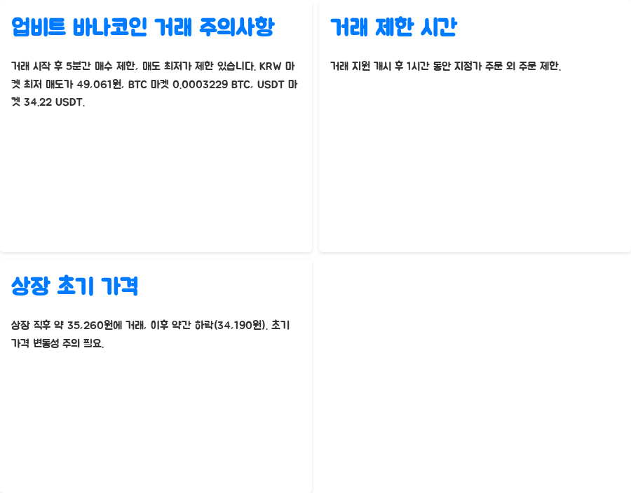 또한, 거래 지원 개시 후 약 1시간 동안은 지정가 주문 외의 모든 주문 타입이 제한됩니다. 상장 당일 바나코인은 거래 시작 직후 약 35,260원에 거래되었고, 이후 약간 하락하여 34,190원에 거래되었습니다.