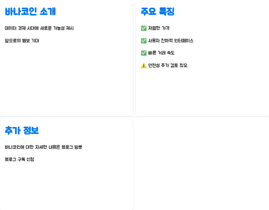 Q3. 바나코인 투자는 안전한가요? A. 모든 투자에는 리스크가 존재합니다. 바나코인 역시 시장 상황에 따라 가격 변동성이 있을 수 있으므로 신중한 투자 결정이 필요합니다. 공식 자료를 참고하고 투자 전문가의 의견을 듣는 것도 좋은 방법입니다.