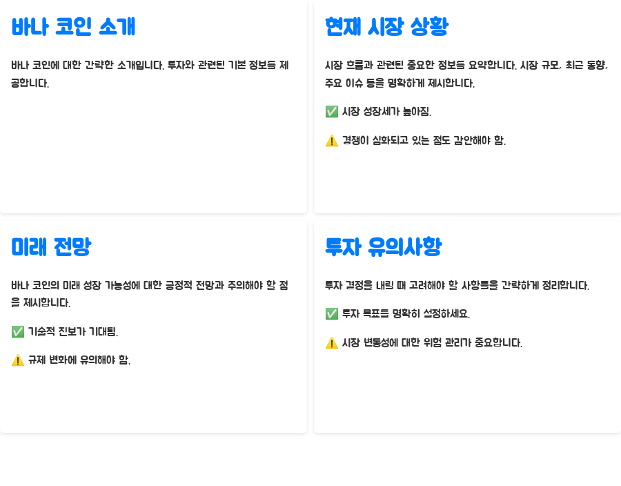 Q2. 바나코인 투자는 안전한가요? A. 모든 투자는 리스크를 수반합니다. 암호화폐 투자는 높은 변동성을 가지므로 신중한 접근이 필요합니다.