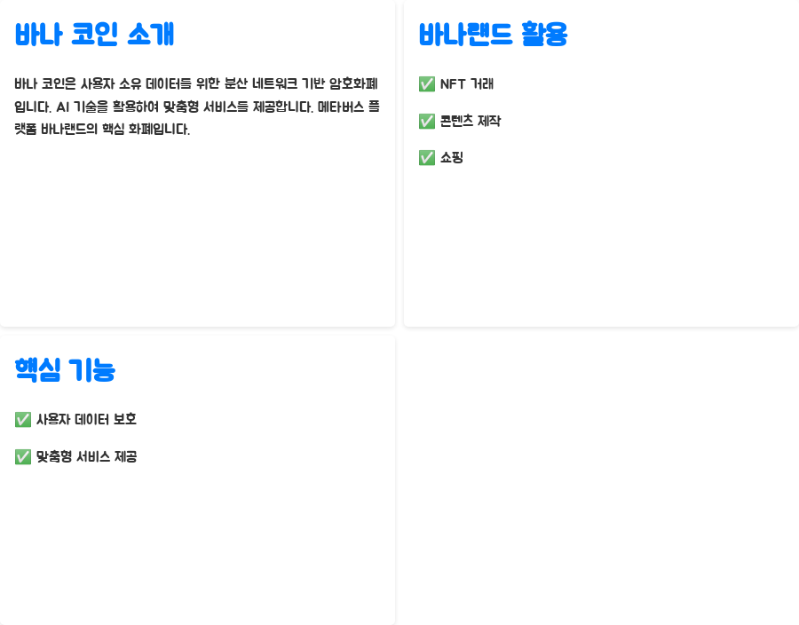 인공지능(AI) 기술을 활용하여 사용자에게 맞춤형 서비스를 제공한다는 점이 큰 특징입니다. 특히 메타버스 플랫폼인 바나랜드에서 핵심 화폐로 사용되면서 더욱 주목받고 있습니다.