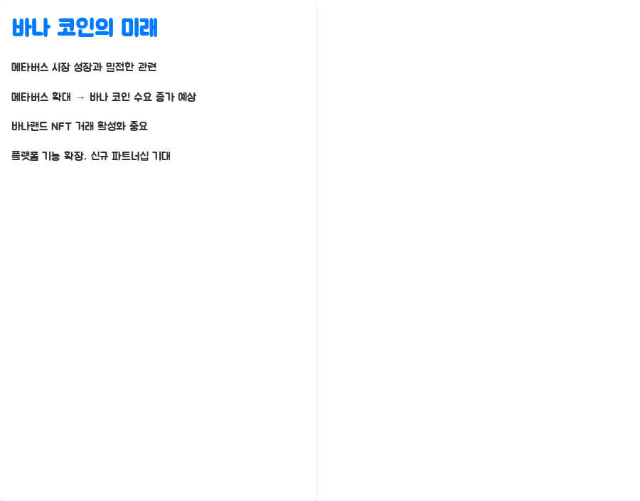 바나 코인의 미래는 메타버스 시장의 성장과 밀접하게 연결되어 있습니다. 메타버스 시장이 확대될수록 바나 코인의 수요 또한 증가할 것으로 예상됩니다.