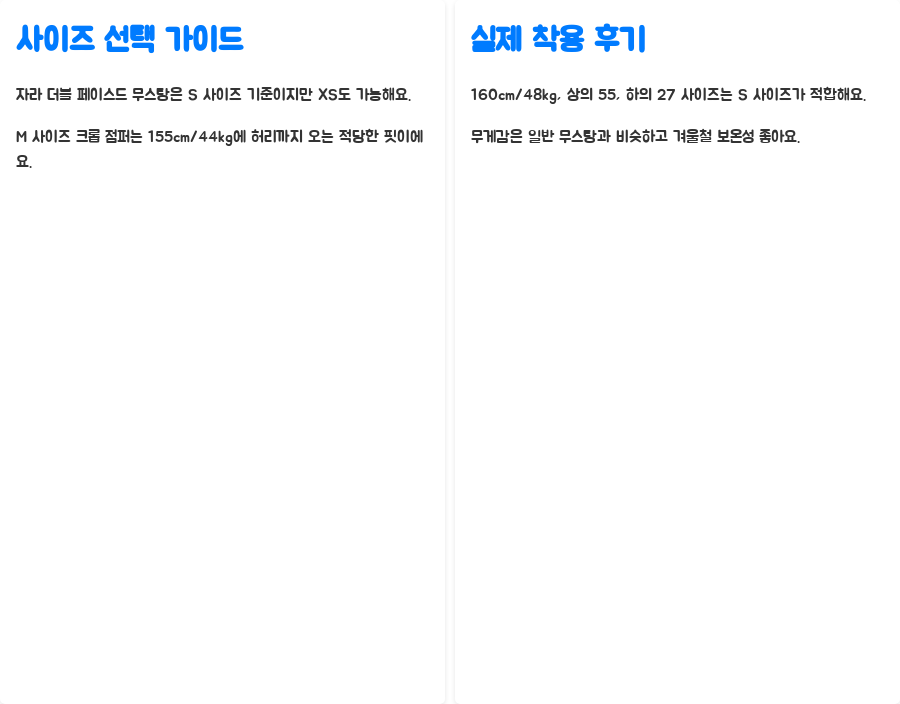 블로그 '엄마둥이'에서는 키 160cm, 몸무게 48kg, 상의 55, 하의 27 사이즈 기준으로 자라 무스탕 S사이즈를 착용한 리뷰를 확인할 수 있습니다. 무게감은 일반적인 무스탕 자켓과 유사하여 겨울철 보온성을 충분히 제공합니다.