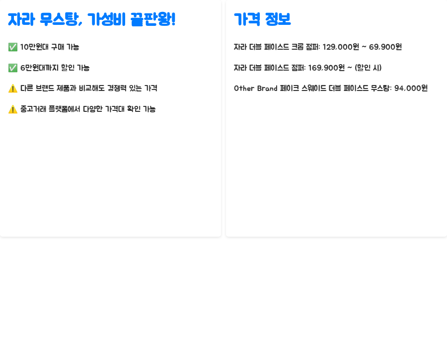자라 더블 페이스드 크롭 점퍼는 129,000원, 더블 페이스드 점퍼는 최대 169,900원으로 10만원대에 구매 가능합니다. **할인 적용 시 69,900원까지 가격이 낮아지는 경우도 있어 가성비를 중시하는 소비자들에게 매력적인 선택지**입니다.