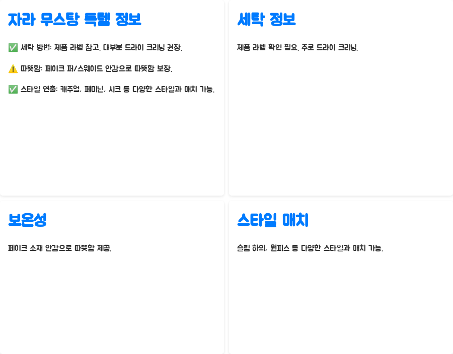 Q1. 자라 더블 페이스드 무스탕의 세탁 방법은? A. 제품에 따라 세탁 방법이 다르므로, 제품 라벨에 기재된 세탁 방법을 준수하는 것이 중요합니다. 대부분 드라이 크리닝을 권장합니다.