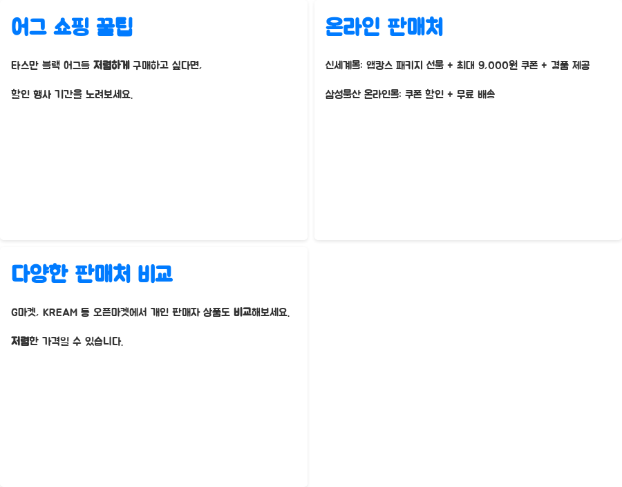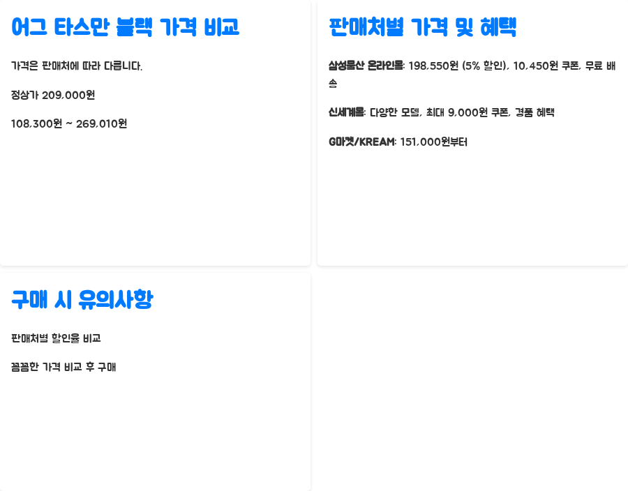 어그 타스만 블랙을 좀 더 저렴하게 구매하고 싶다면, 각 판매처의 할인 행사 기간을 노려보는 것이 좋습니다. 신세계몰에서는 앱캉스 패키지 선물과 최대 9천 원 쿠폰, 경품 혜택을 제공하고 있으며, 삼성물산 온라인몰에서는 쿠폰 할인과 무료 배송 혜택을 제공하고 있습니다.