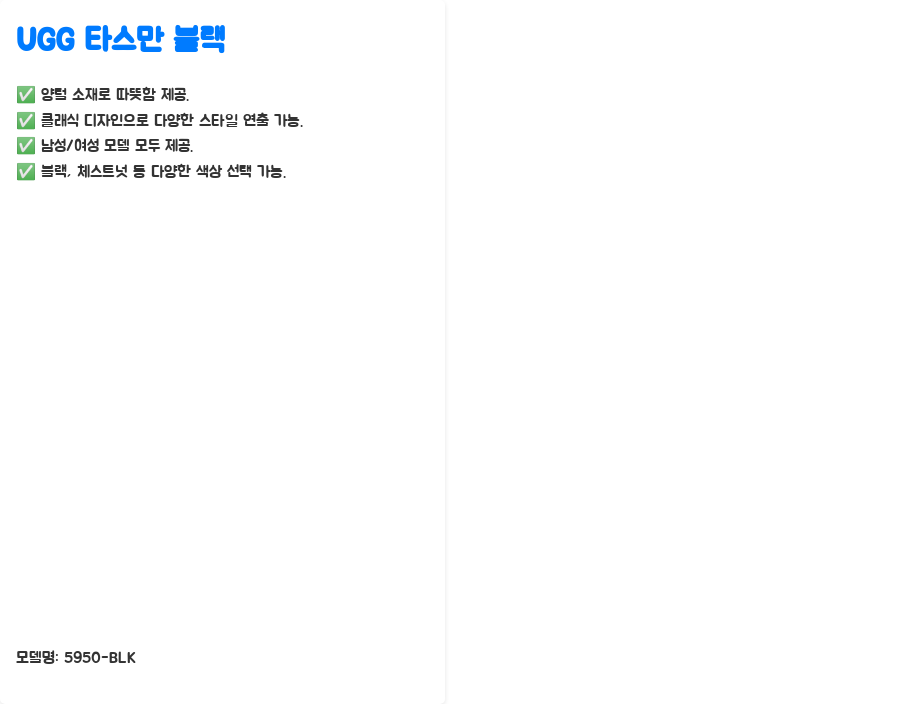 UGG 타스만 블랙은 양털 소재의 따뜻한 방한 슬리퍼로, 모델명은 5950-BLK입니다. 겨울철 발을 따뜻하게 유지해주는 기능성은 물론, 클래식한 디자인으로 어떤 옷에도 잘 어울리는 스타일까지 갖춘 실용적인 아이템이죠.
