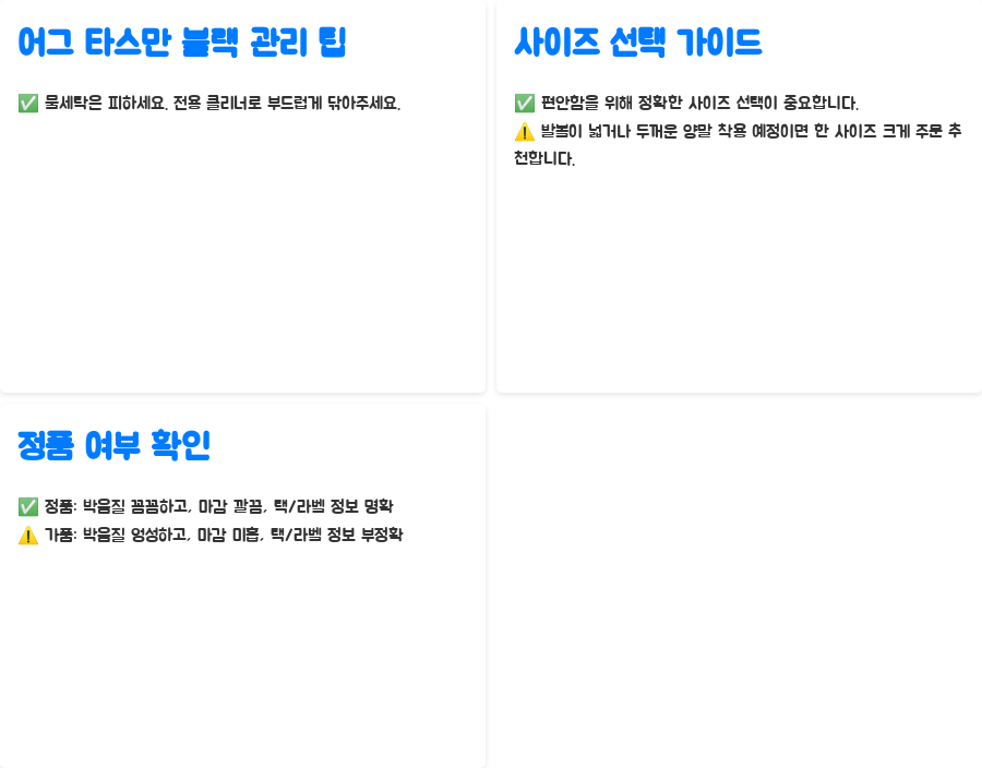 Q3. 어그 타스만 블랙 정품과 가품은 어떻게 구별하나요? A. 정품 어그는 박음질이 꼼꼼하고 마감 처리가 깔끔하며, 택과 라벨에 정품임을 인증하는 정보가 표기되어 있습니다. 가품은 박음질이 엉성하고 마감 처리가 미흡하며, 택과 라벨 정보가 부정확한 경우가 많습니다.