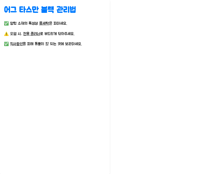 어그 타스만 블랙을 오래도록 새것처럼 신으려면 올바른 관리가 중요합니다. 양털 소재의 특성상 물세탁은 피하는 것이 좋으며, 오염 시에는 전용 클리너를 사용하여 부드럽게 닦아주는 것이 좋습니다.