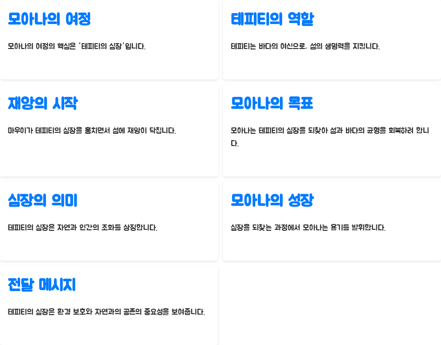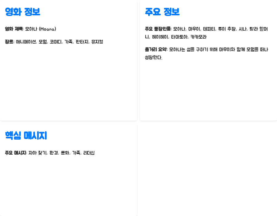 | 주요 등장인물 | 모아나, 마우이, 테피티, 투이 추장, 시나, 탈라 할머니, 헤이헤이, 타마토아, 카카모라 |