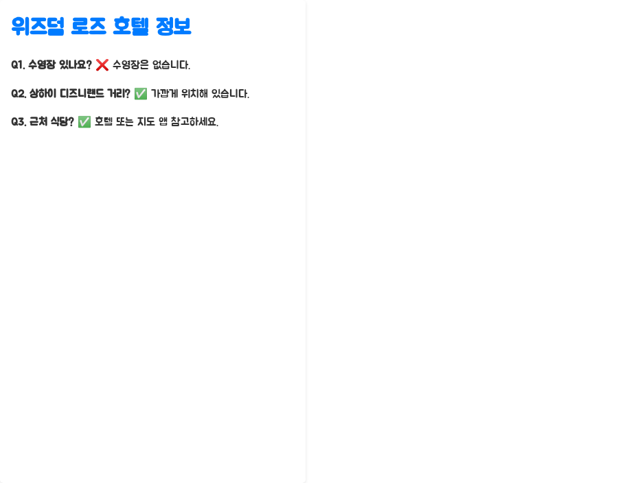 Q3. 호텔 근처에 추천할 만한 식당이 있나요? A3. 호텔 주변에 어떤 식당이 있는지는 직접 호텔에 문의하거나, 지도 앱을 통해 확인하시는 것이 좋습니다.