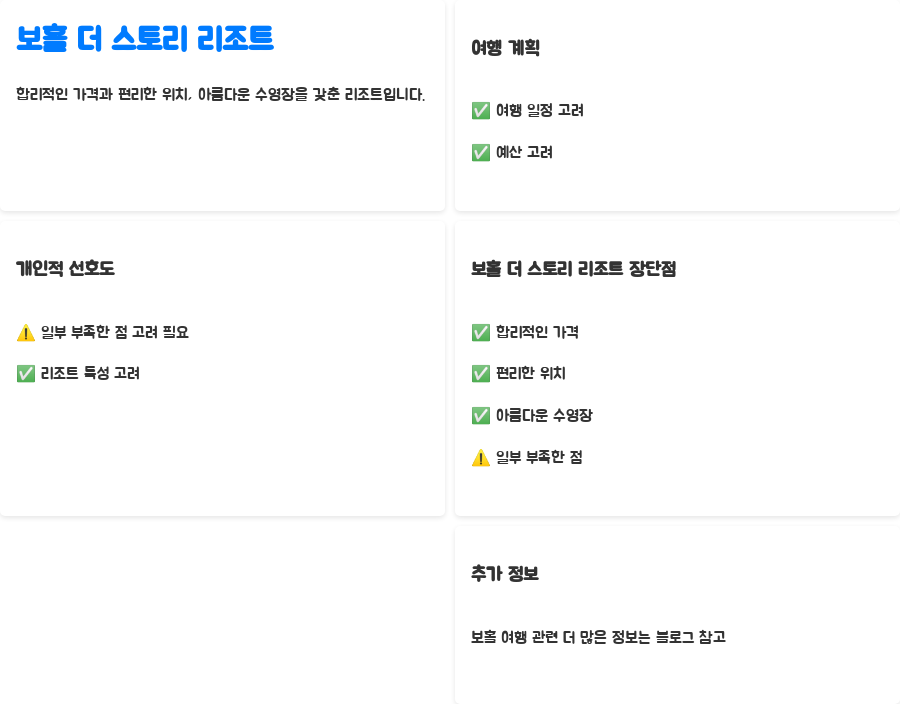여행 계획과 개인적인 선호도를 잘 고려하여, 더 스토리 리조트가 당신에게 최고의 선택인지 신중하게 결정하시길 바랍니다! 다른 보홀 여행 정보가 궁금하시다면, 저희 블로그의 다른 게시글도 방문해주세요!