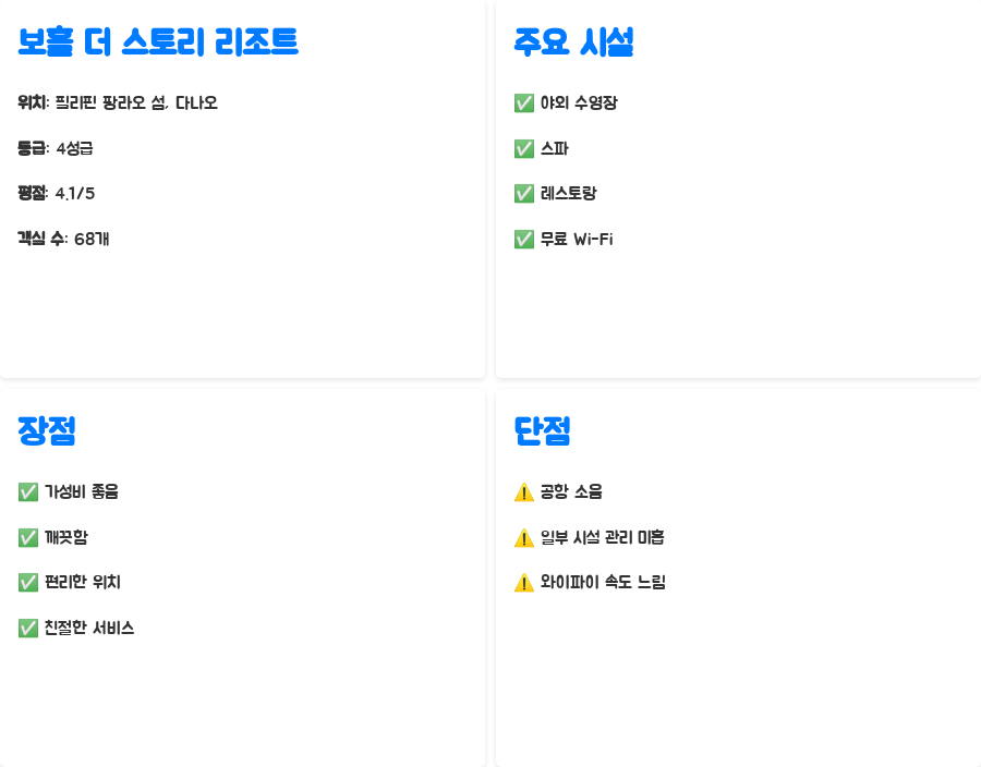 먼저 보홀 더 스토리 리조트에 대한 핵심 정보를 표로 정리해 드릴게요. 필리핀 팡라오 섬 다나오 지역에 위치한 4성급 리조트로, 알로나 비치와 다나오 비치에서 가까운 거리에 있어 관광하기에 편리합니다.