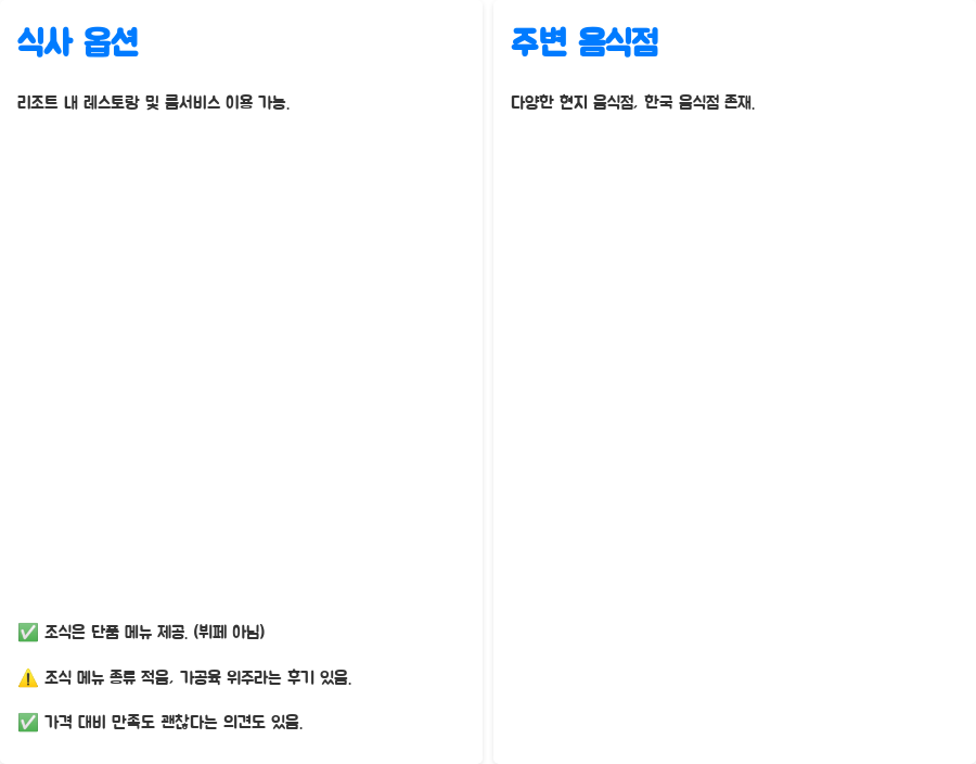 리조트 주변에 다양한 현지 음식점과 한국 음식점이 있어 식사 걱정은 하지 않아도 될 것 같습니다.
