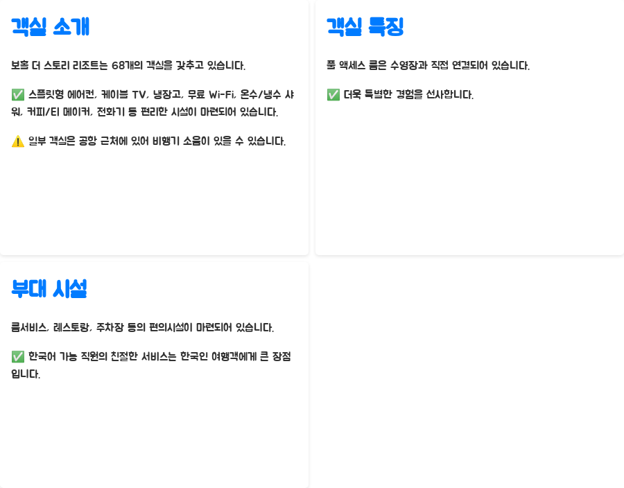 | 수영장과 바로 연결된 풀 액세스 룸 존재 | 냉장고 및 커피포트 청소 미흡 후기 존재 |