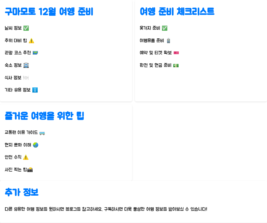 오늘 알아본 내용 어떠셨나요? 구마모토 12월 날씨에 대한 궁금증이 조금이나마 해소되셨기를 바랍니다.