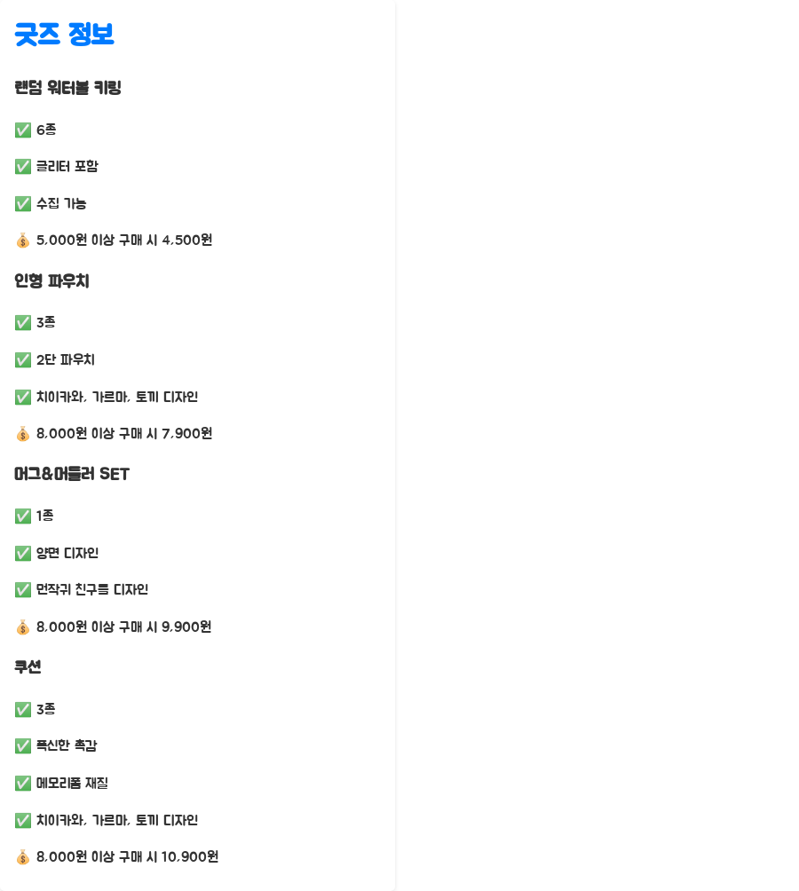 귀여운 디자인은 물론, 실용성까지 갖춘 굿즈들을 직접 사용해보니 정말 만족스러웠습니다.
