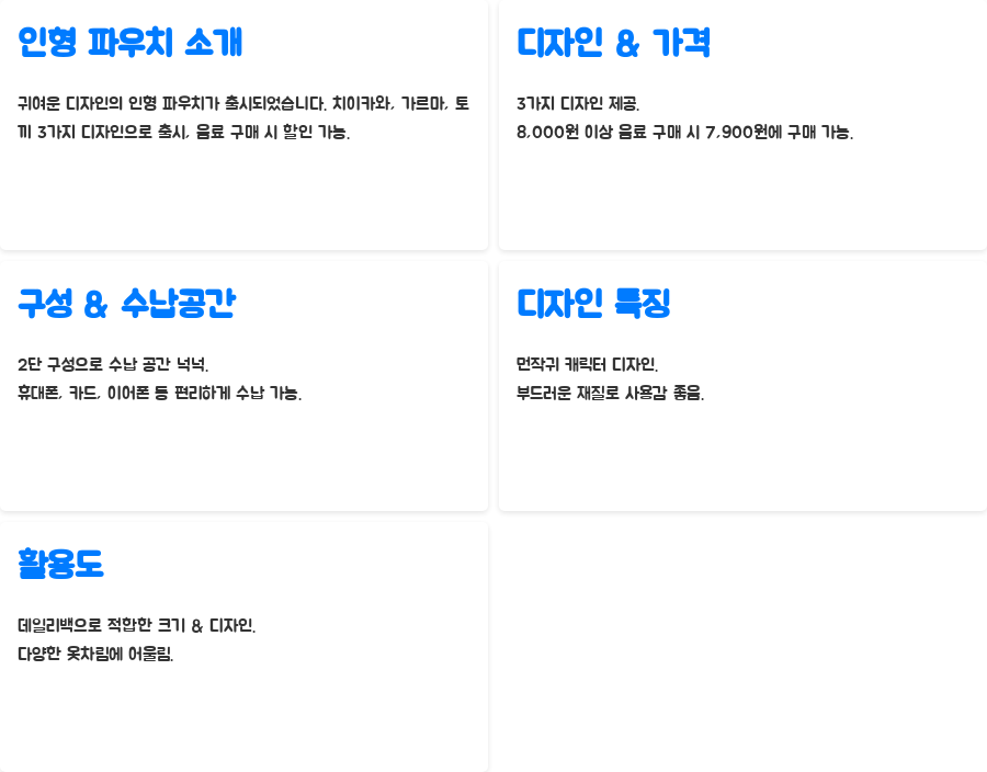 | 인형 파우치 | 8,000원 이상 구매 시 7,900원 | 3종, 2단 파우치, 치이카와, 가르마, 토끼 디자인 |