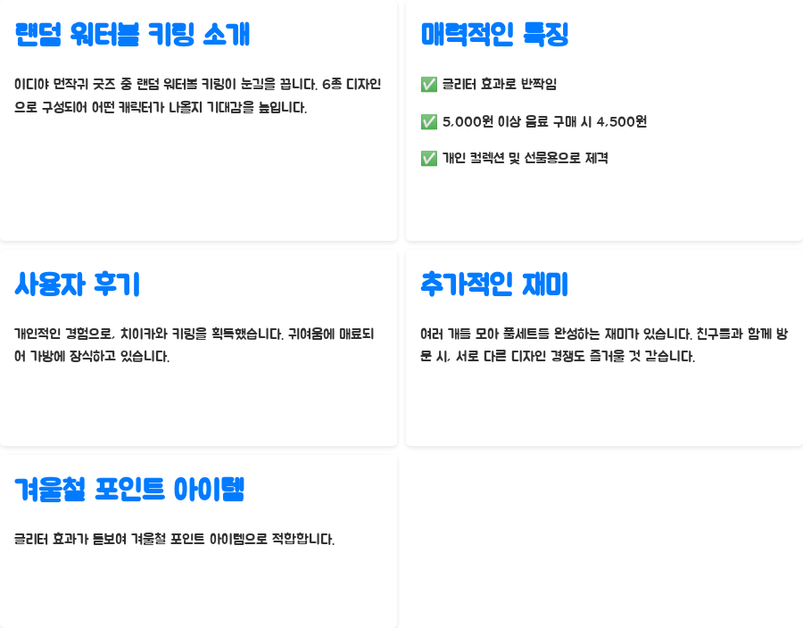 | 랜덤 워터볼 키링 | 5,000원 이상 구매 시 4,500원 | 6종, 글리터 포함, 수집 가능 |