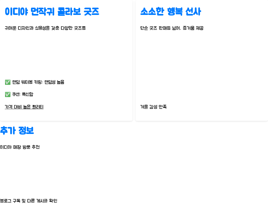 이디야커피와 먼작귀의 만남이라니, 상상만 해도 설레지 않나요? 귀여운 먼작귀 캐릭터들이 이디야 굿즈로 변신하여 겨울을 더욱 따뜻하고 행복하게 만들어 줄 이벤트가 시작됐습니다.