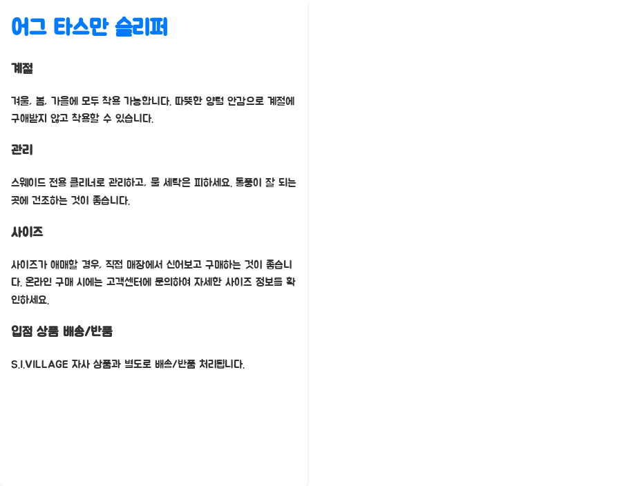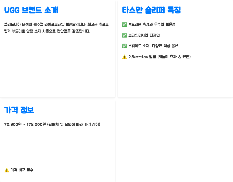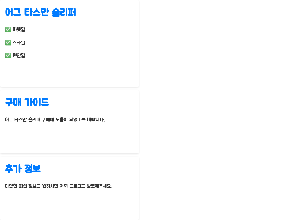 오늘 알아본 어그 타스만 슬리퍼, 어떠셨나요? 따뜻함과 스타일, 편안함까지 모두 갖춘 완벽한 겨울철 필수템이죠!