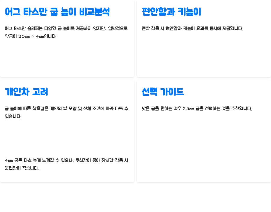 하지만, 굽 높이에 따른 착용감의 차이는 개인의 발 모양과 신체 조건에 따라 다르게 느껴질 수 있습니다.